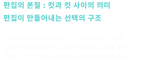 편집은 시간을 줄이거나 늘리고, 공간을 설계합니다. ∙ 시간의 압축 ∙ 시간의 확장 ∙ 시간의 교차 ∙ 공간을 보여주는 편집 | |||