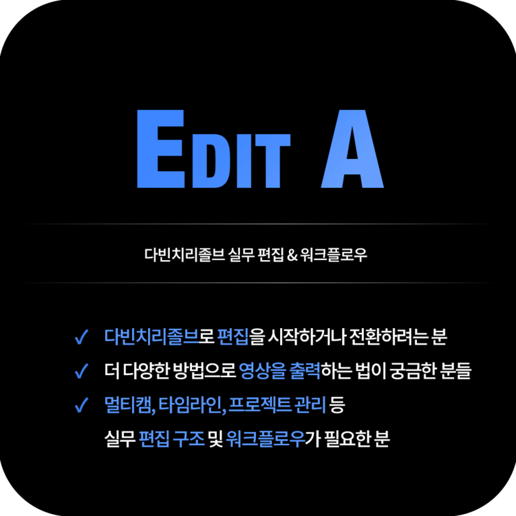 기본적인 컷 편집을 넘어, 다빈치 리졸브를 하나의 작업 환경으로활용하고 싶은 분들을 위한 클래스입니다.편집 기능은 물론, Effect·Fusion·Fairlight까지다빈치 리졸브 안에 있는 도구들을 연결해 사용하는 방식을 다루며,실제 포스트 프로덕션 현장에서 사용되는 워크플로우를 기준으로 편집을 확장합니다.
